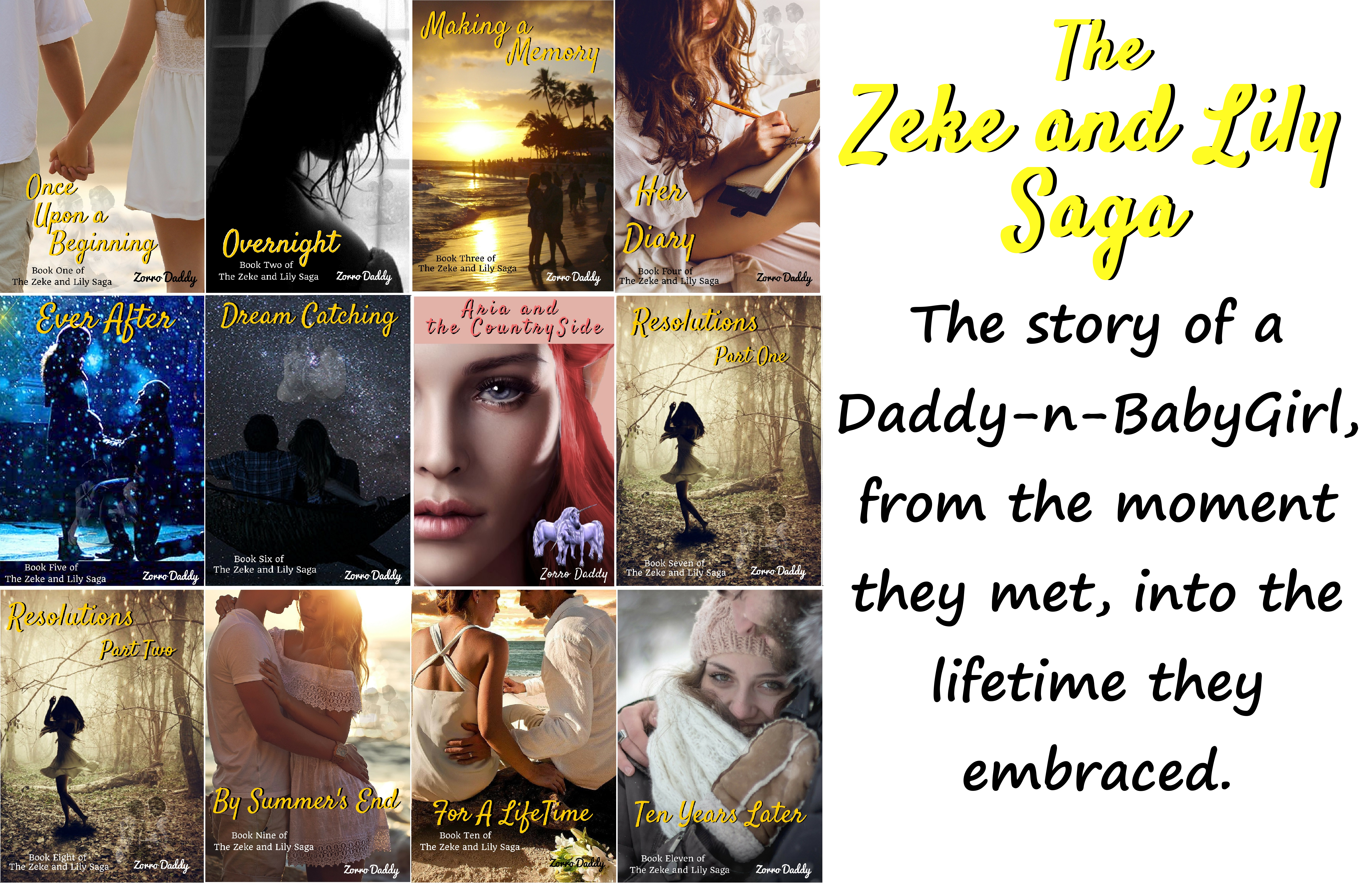 The Zeke and Lily Saga – Before Zeke (a “Daddy” and an author) and Lily (a “BabyGirl” and a newspaper columnist) met, they were perfect strangers who shared a common interest in a fetish. They were perfect for each other and though they lived in the same city, they hadn’t met until Lily happened upon Zeke’s profile online. These stories tell their tale, from courting to love to a