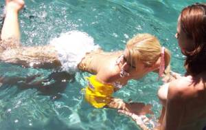 She kicked her feet, splashing water but not treading any. Through each frustrated attempt, her Nanny held her hands and kept encouraging her to try.